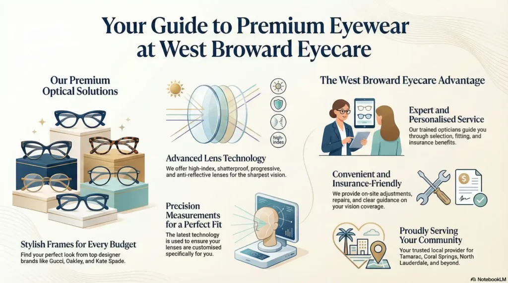 Whether you’re visiting for an eye exam, new eyeglasses, or specialty contact lenses, our experienced team is here to serve you. We take pride in offering personalized care and high-quality vision solutions, ensuring our patients enjoy healthy eyes and clear vision. Come see why so many in the West Broward area near you trust us with their eye care needs!