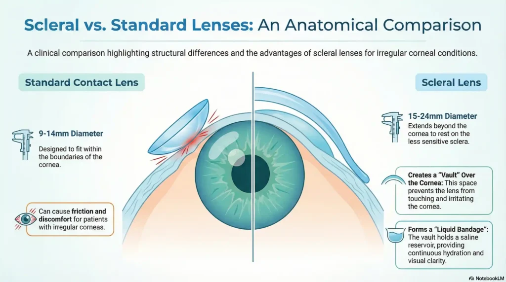 Unlike standard contact lenses that typically measure 9-14 millimeters in diameter, scleral lenses range from 15-24 millimeters, completely vaulting over the cornea. This unique design allows them to bypass corneal irregularities entirely, creating a new, perfectly smooth optical surface for light to pass through.
